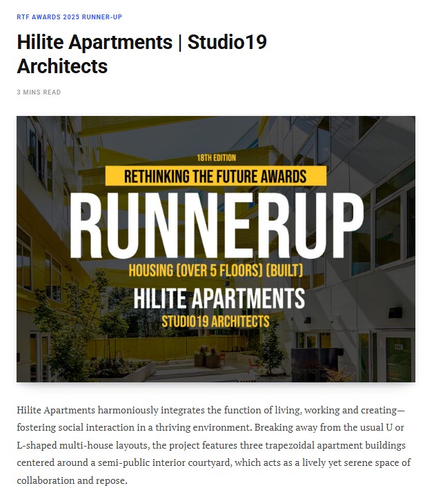 Hilite Apartments Awarded Runner-Up in RTF Awards: Housing (Built)