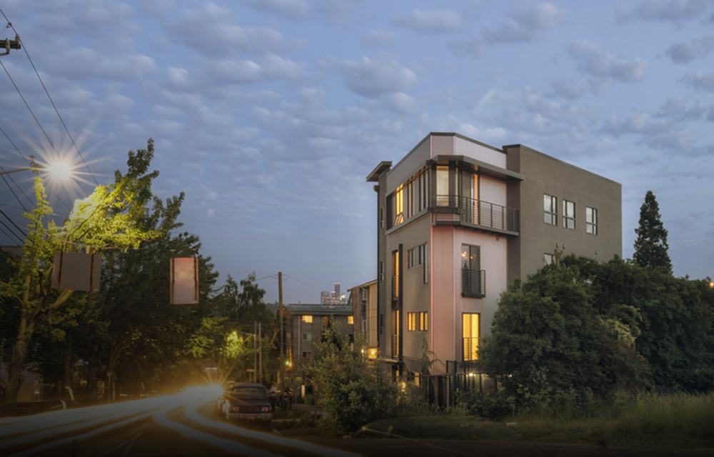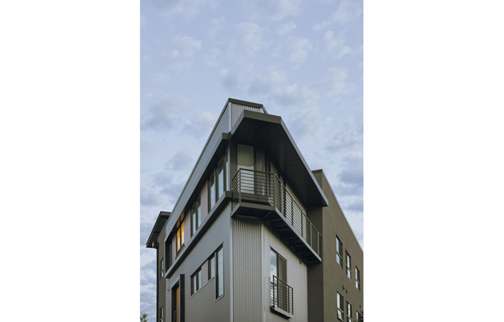 This LEED Gold certified 23-unit congregated housing project is situated on a triangle 3,200 SF lot next to I-5 highway ramp. The building shape and highly efficient floor plan layout responds well to the site geometry. The material palate and architectural details further elevates its industrial aesthetic to make it a good fit for its targeted users. The warm orange accent color panels add contrast to the otherwise muted color palate while breaks down the perceived massing to fit into the surroundings.
