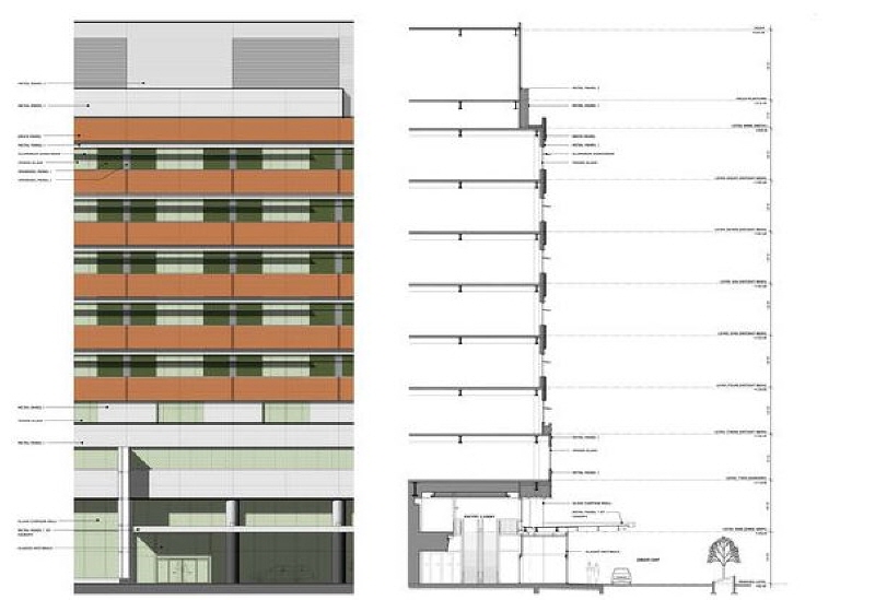 and preserving views. Brick bands, metal panels and glass relate to the existing buildings to create a