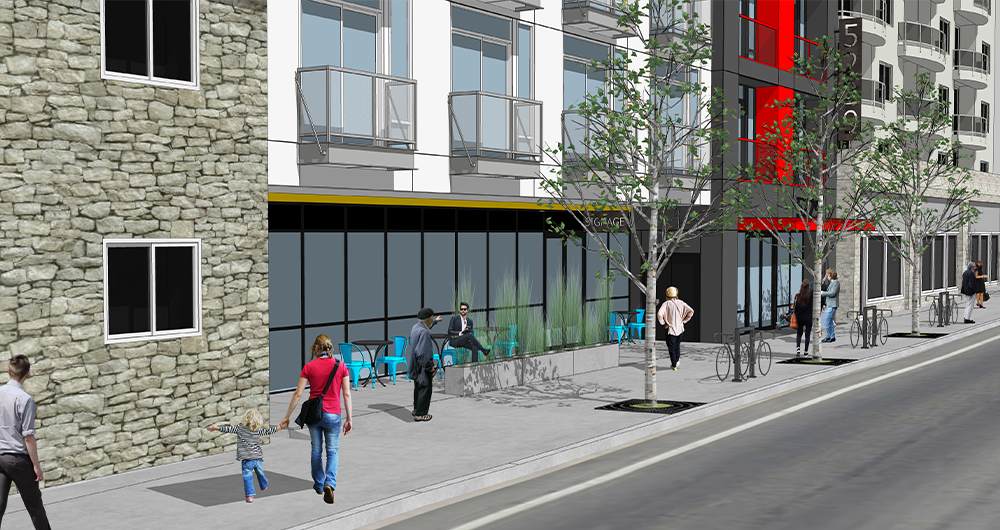 Our design is centered around the enhancement of the pedestrian experience and simplicity of the form. The massing is designed to cater to the street level experience and differentiate between uses. In order to allow the massing to read clearly, our intention is to keep the material palette simple, allowing it to enhance the design and not distract from the user experience.